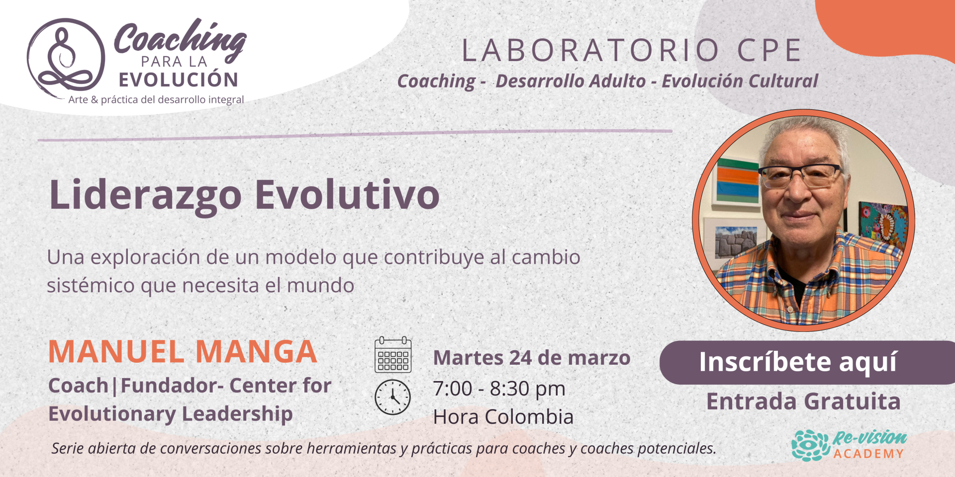 El primer encuentro será el martes 24 de marzo a las 7:00 pm (hora Colombia). Será una sesión abierta donde compartiré la visión de esta iniciativa y abriremos un espacio de diálogo y práctica para quienes quieran acercarse al mundo del Coaching para la Evolución (CPE).